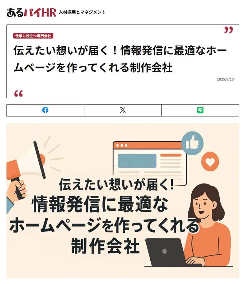 記事では、「伝えたい想いをしっかりと汲み取り、目的に沿ったサイトを丁寧に制作してくれる信頼の制作会社」が特集されています。弊社もそのひとつとして、